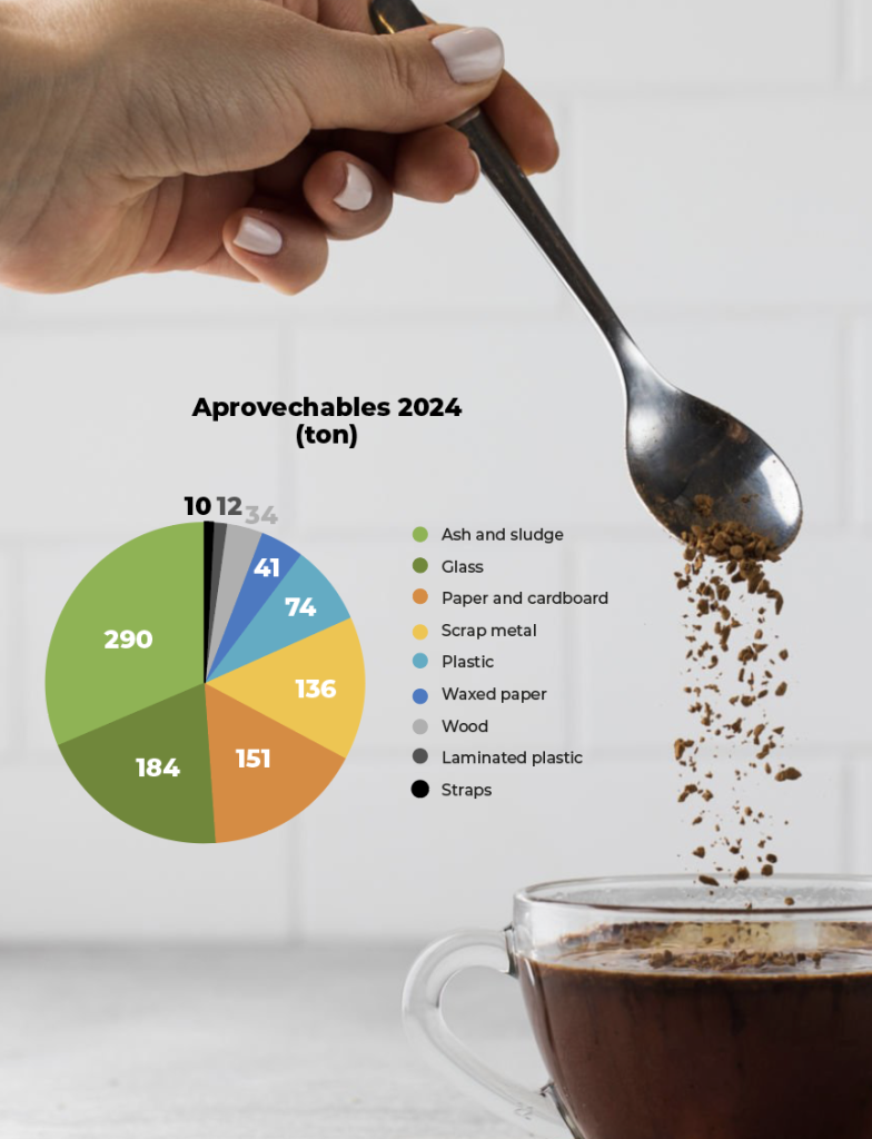 El 97% de los residuos de Buencafé corresponde a la borra, 100% de la cual fue usada en las calderas como sustituto del gas natural y generó un ahorro de $3.775 millones. El 3% restante son otros orgánicos, reciclables y peligrosos, reduciendo 27% la disposición en relleno sanitario vs. 2023. Casi 100% de los demás residuos orgánicos se hicieron compostaje, con solo 0,4% dispuestos en relleno