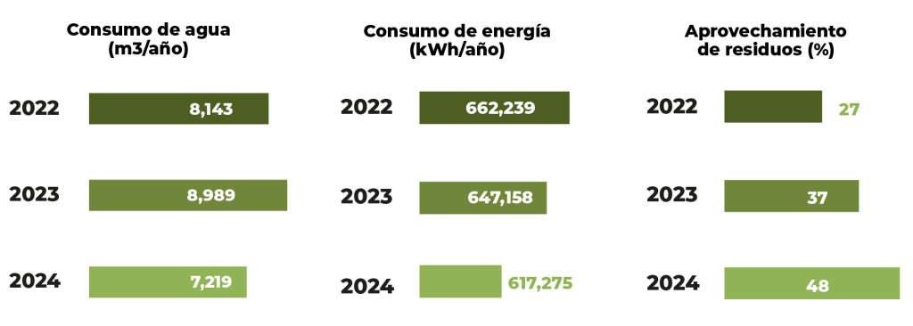 El control de consumo de agua y energía en el Centro Nacional de Investigaciones de Café (Cenicafé) ha llevado a una estabilización, por lo que ahora no se tienen metas de reducción, sino límites de consumo, que en 2024 fueron 40,9 l/experimento-día para el agua y 2,4 kWh/ experimento-día para la energía eléctrica, mejorando su desempeño ambiental y cumpliendo al 100% las metas. [GRI 306-2, 306-4] Además, se aprovechó 48% de los residuos sólidos, 11% más versus 2023 y superando la meta propuesta.